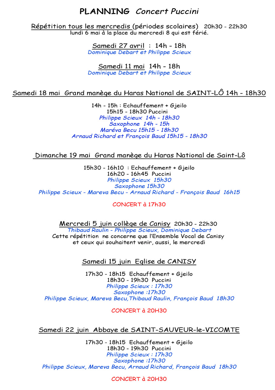 Planning des répétitions de mai-juin